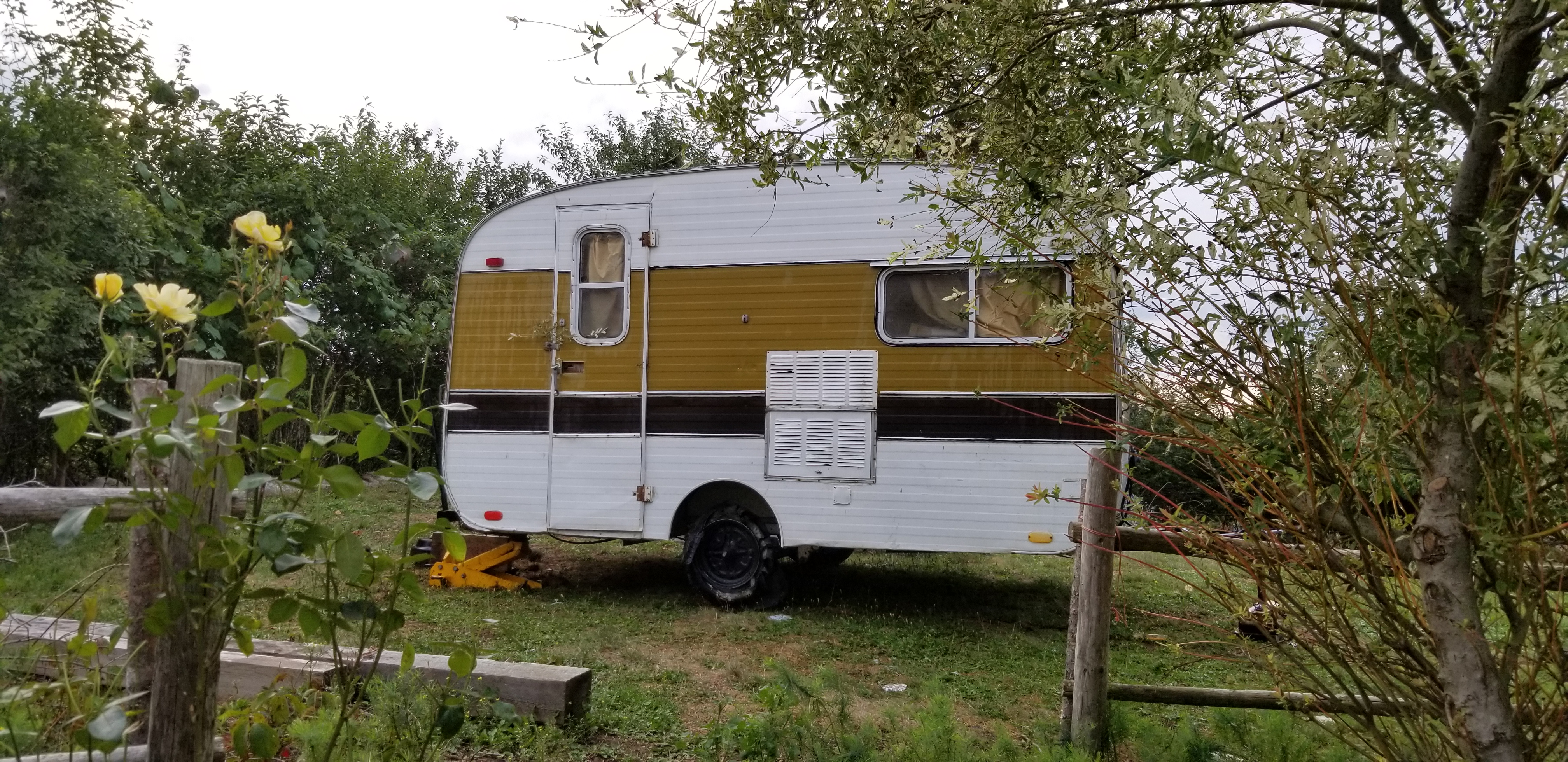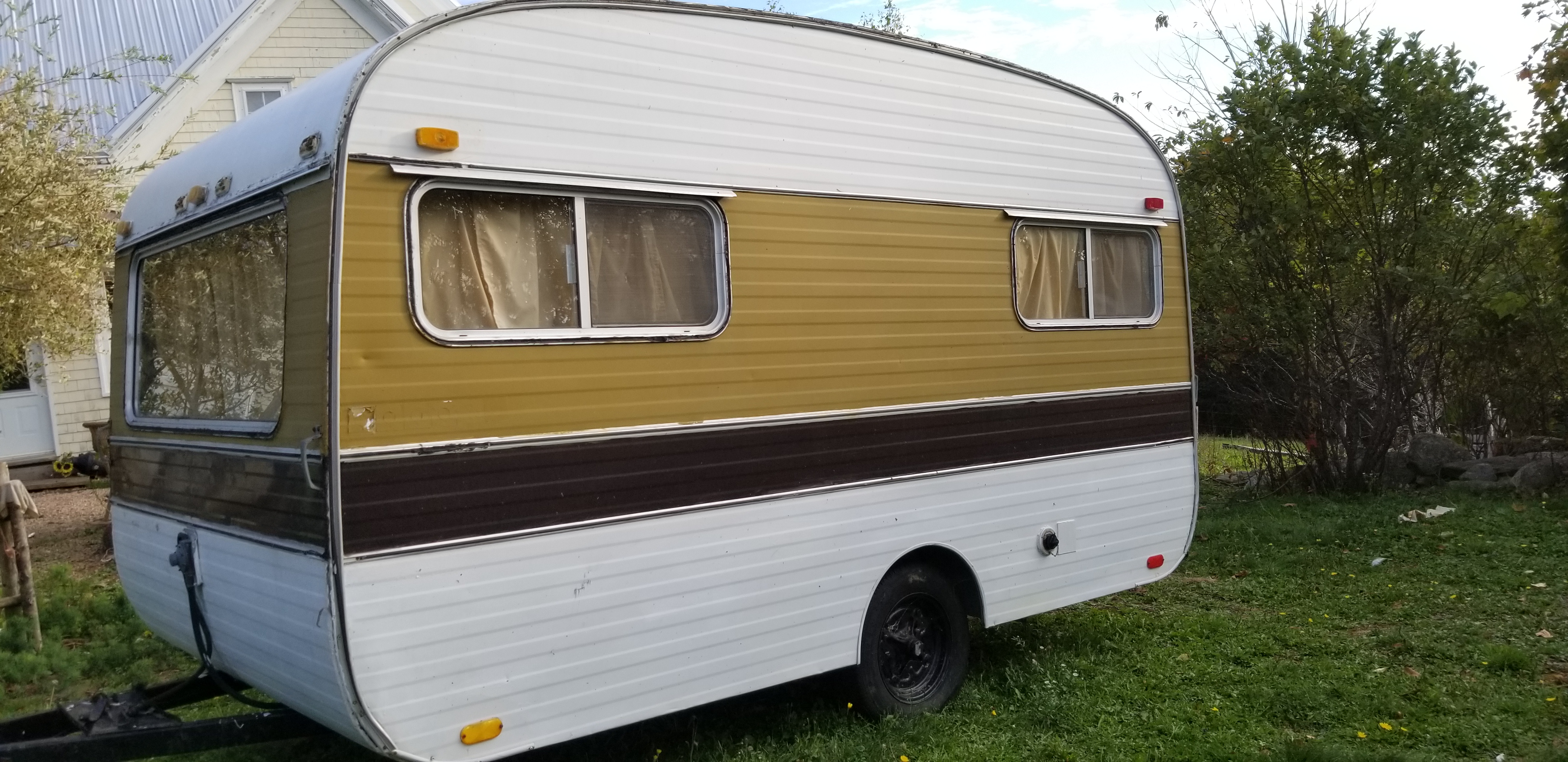 I’ve wanted a vintage camper trailer for a few years now. I love looking at the camper makeovers on Pinterest and dreamed about finding one in decent shape. One day while travelling a back road I noticed one parked under a tree in the someone’s front yard. I thought to myself that might be the one I will own. I never mentioned it to anyone, then one day my husband said he found a trailer. He said he could get it for a good price and we went to see it. There we were, driving into the driveway of the trailer I had seen a few months before! It is in fair shape for the age, it’s a 1976 Cygnet https://tincantourists.com/wiki/cygnet/
